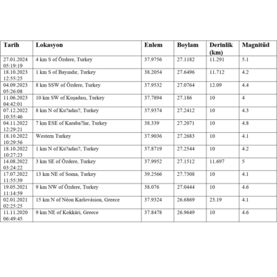 Parsel merkezli 100km alandaki rapor oluşturulma tarihinden önceki son 10 yılda yaşanan 4 üstü şiddetindeki depremler otomatik olarak çekilip tablo şeklinde raporunuza eklenir.