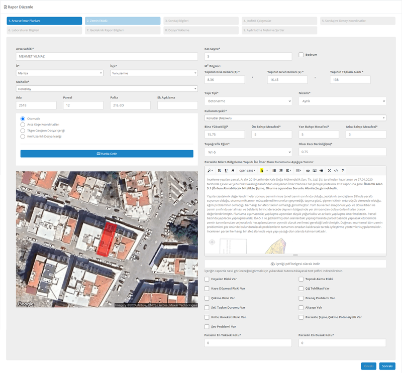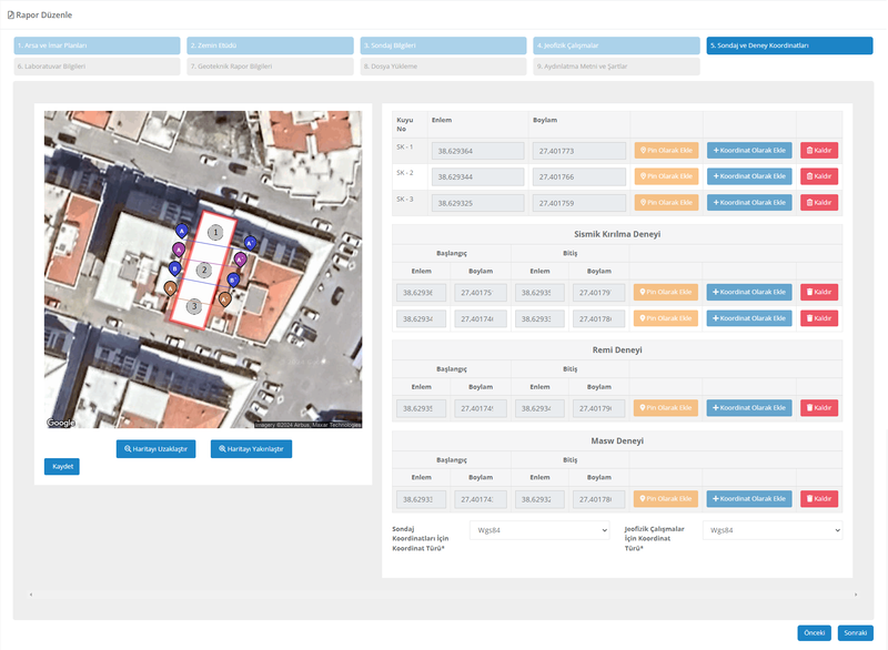 Parseliniz üzerinde gerçekleştirdiğiniz sondajların koordinatlarını ve jeofizik deneylerini harita üzerinde kolayca işaretleyebilirsiniz. Bu işlem, otomatik olarak mühendislik jeolojisi haritasının ve araştırma noktaları krokisinin oluşturulmasını ve raporun ilgili bölümlerine eklenmesini sağlar.