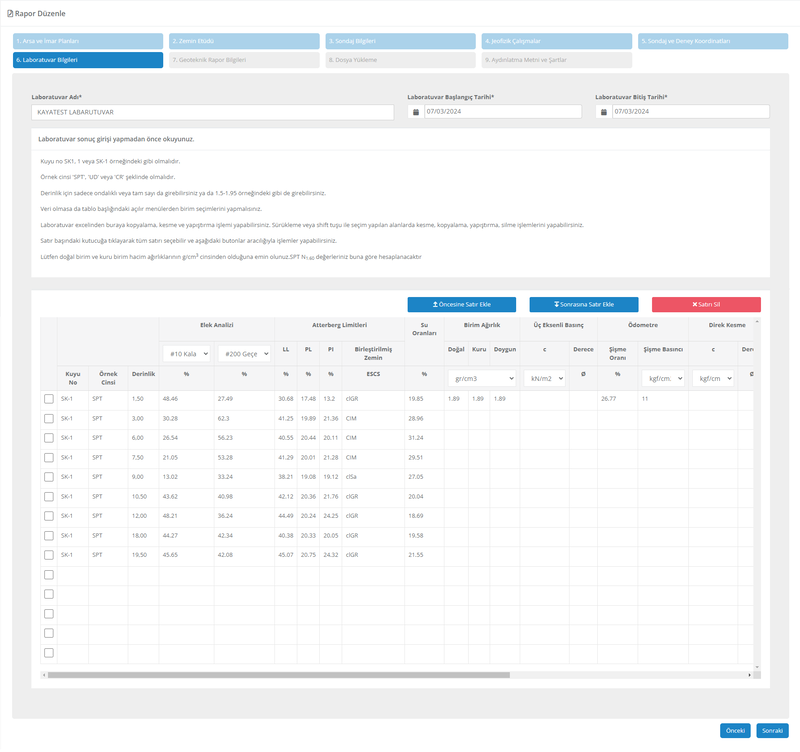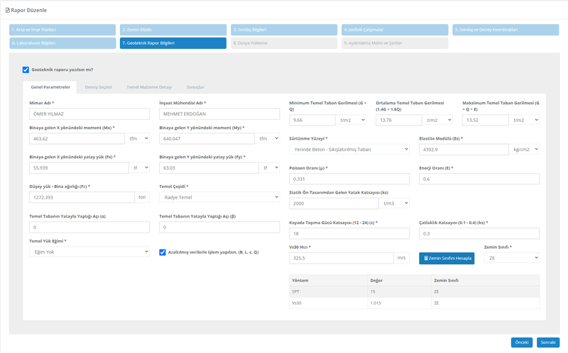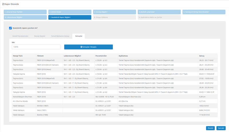 Daha önce girmiş ve seçmiş olduğunuz bilgiler ve parametrelerle geoteknik raporunuzda göreceğiniz sonuçları önceden görmüş olursunuz. Böylece sürpriz yaşamazsınız.