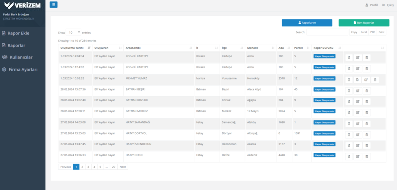 Mevcut ve geçmiş raporlarınızın durumularını görebilir, inceleyebilir ve Verizem web arayüzü üzerinden ilgili bilgileri düzenleyerek onları güncelleyebilirsiniz.