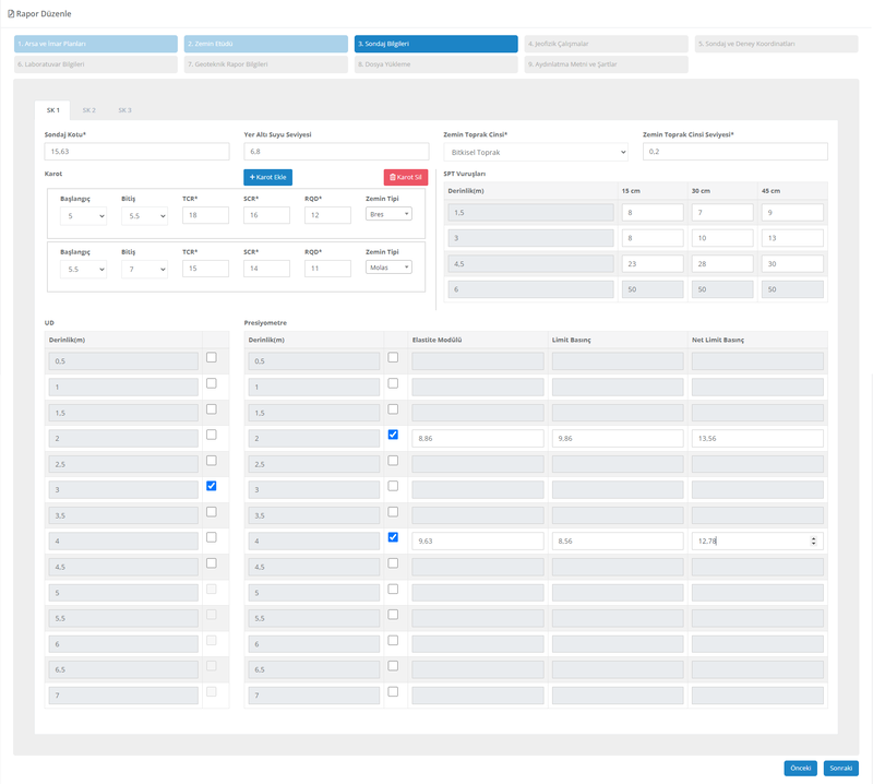 Sondaj bilgi ekranı üzerinden SPT vuruşlarınızı girdiğinizde, sistemimiz otomatik olarak SPT tablonuzu oluşturur ve aynı zamanda N60 ile N1,60 değerlerinizi hesaplar. Bu değerler, raporunuzun 3.4 Arazi Deneyleri bölümüne otomatik olarak eklenir.